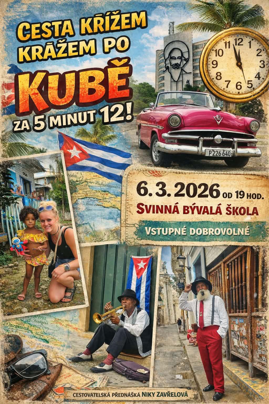 V pátek 6.3. od 19 hodin proběhne ve škole cestovatelská beseda Niky Zavřelové o putování po Kubě.